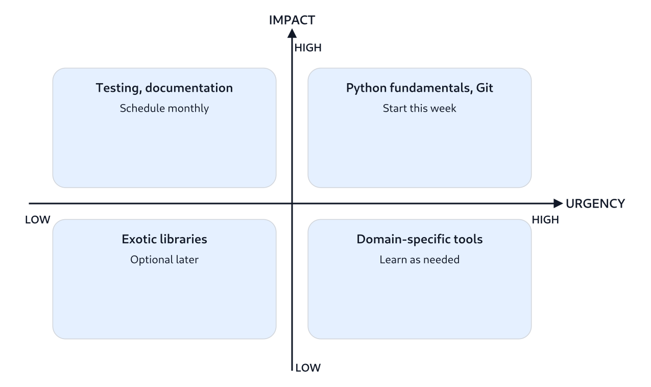 High-impact, high-urgency skills, such as solid Python syntax, control flow, data structures, and basic Git commands, deserve your immediate attention. These skills transfer across all domains and signal professionalism to employers. High-impact but lower-urgency skills, like test-driven development and clear documentation, should get regular but less intense focus.