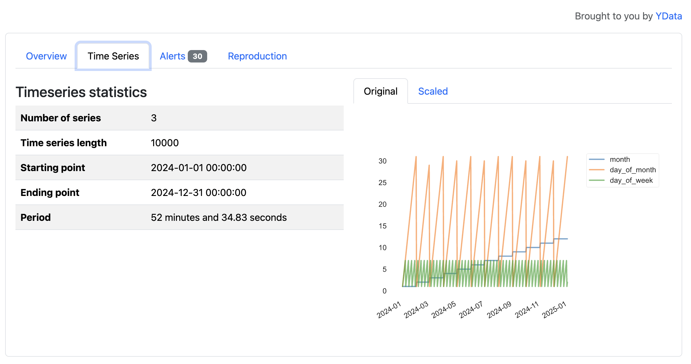 In this flight dataset, the time series features reveal patterns tied to the calendar, such as cycles across months, days of the month, and days of the week in 2024. These variables primarily reflect how a calendar year progresses, but the visualizations illustrate how YData Profiling surfaces temporal structure in time series data.