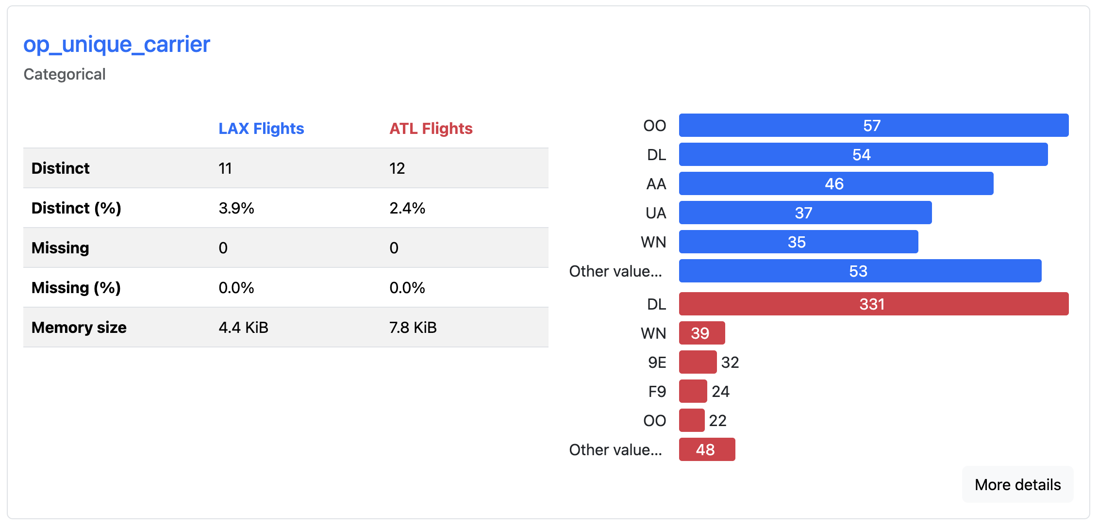 The comparison report displays side-by-side statistics, highlighting where distributions have shifted, means have changed, or new patterns have emerged. Color-coded differences draw attention to changes between the datasets, allowing you to spot when data characteristics have evolved over time. Here, you can quickly see which airlines fly most frequently out of each airport. DL is most common from ATL, whereas OO is the most common from LAX.
