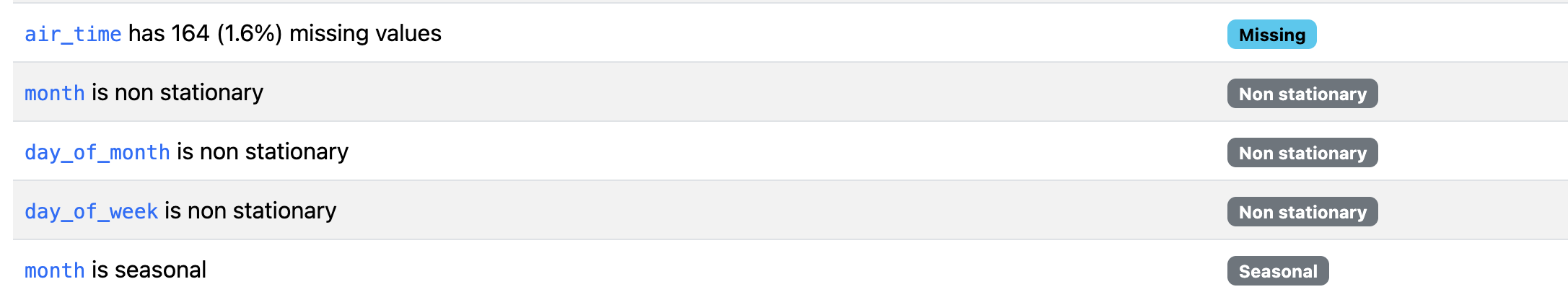 The tsmode=True parameter enables time series analysis features, and the sortby="fl_date" ensures the data is ordered chronologically. For time series analysis to work correctly, your data should be sorted by the time column, either by your own analysis or the sortby argument. If your date column isn’t already a datetime type, then you should convert it first: